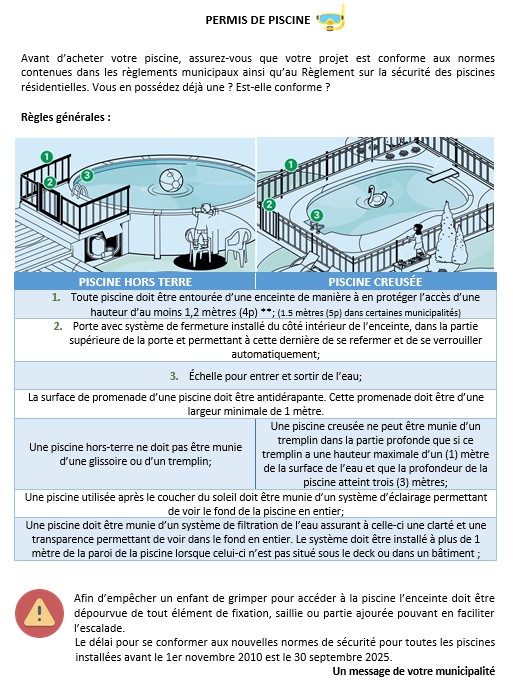 Retour Piscines - Normes de sécurité Le délai pour se conformer aux nouvelles normes de sécurité pour toutes les piscines installées avant le 1er novembre 2010 est le 30 septembre 2025.Cliquez sur le lien suivant pour obtenir plus d'informations : https://www.quebec.ca/habitation-territoire/piscines-et-spas/securite-piscines-residentielles/securisez-piscine Date de création: 2025-05-13