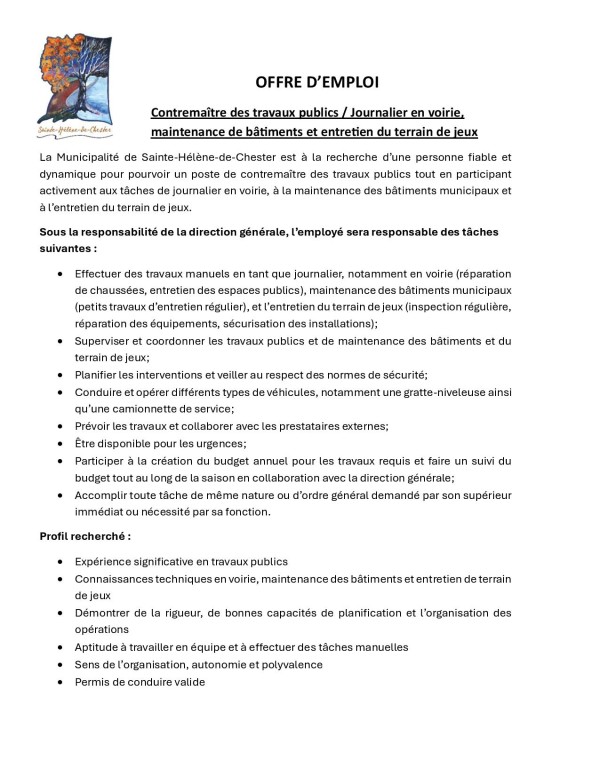 La Municipalité de Sainte-Hélène-de-Chester est à la recherche d'une personne fiable et dynamique pour pourvoir un poste de contremaître des travaux publics tout en participant activement aux tâches de journalier en voirie, à la maintenance des bâtiments municipaux et à l'entretien du terrain de jeux.